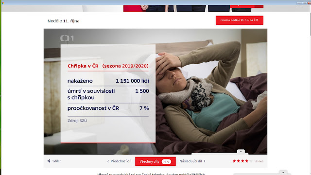 Česká televize v reportáži na téma "Nejsou vakcíny proti chřipce" dne 11. 10. 2020 uvedla počty onemocnělých a zemřelých na chřipku v sezóně 2019/2020, čímž si takzvaně "nachcala do ucha", jak říkala moje babička (kdo by nerozuměl rčení, tak "svou hloupostí si vyrobila problém", jelikož ta čísla se ani trochu nehodí do její hysterické covidové kampaně... což jistě zdárně zamaskuje. Ono se už i stalo, ticho po pěšině...)